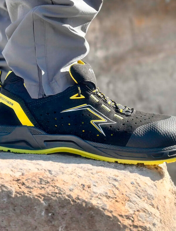 Die neue moderne Grip-Control-Laufsohle bietet die beste Kombination aus Sicherheit und Komfort, auch bei aktivem Gebrauch der Schuhe. Die Zwischenschicht aus Polyurethan ist mit antistatischen Zusätzen versehen, während die stoßdämpfenden Eigenschaften die Energie bei intensiven Belastungen dämpfen. Die Laufschicht ist eine spezielle Zusammensetzung aus TPU, die ebenfalls antistatische Eigenschaften aufweist. Dank moderner Technologien haben wir das Spitzengewicht der Laufsohle erreicht, das sich direkt auf das Gewicht des gesamten Schuhs auswirkt. Die neue Entwicklung ist nicht weniger einzigartig: 85% der Lauffläche besteht aus kleinen gleichseitigen Dreiecken, deren Kanten in verschiedene Richtungen ausgerichtet sind. Eine solche Konstruktion steuert die Positionierung des Fußes auf einer rutschigen oder unebenen Oberfläche. Damit hält jede Seite eines solchen Dreiecks sicher das Gleiten in jede Richtung. Die Vorderseite der Außensohle ist in Flex-Zonen unterteilt, die eine einfache Bewegung ermöglichen. Die Fersenzone hat eine optimale Kontaktfläche mit der Oberfläche, was zu einem besseren Gleichgewicht in einer statischen Position oder in der Bewegung führt