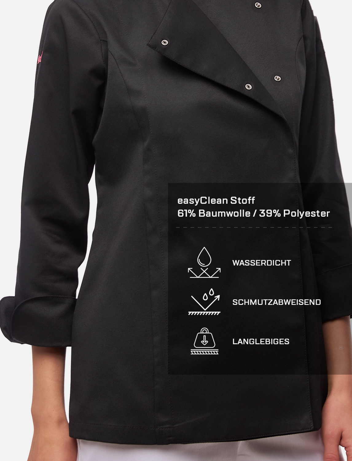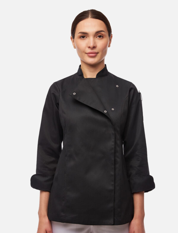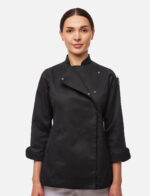 Erleben Sie die perfekte Kombination aus Stil und Funktionalität mit der Damen Kochjacke Langarm mit Druckknöpfen aus easyClean Baumwolle. Diese moderne Kochjacke in elegantem Schwarz bietet nicht nur ein ansprechendes Design, sondern auch herausragende Eigenschaften, die Ihre Arbeit in der Küche erleichtern.